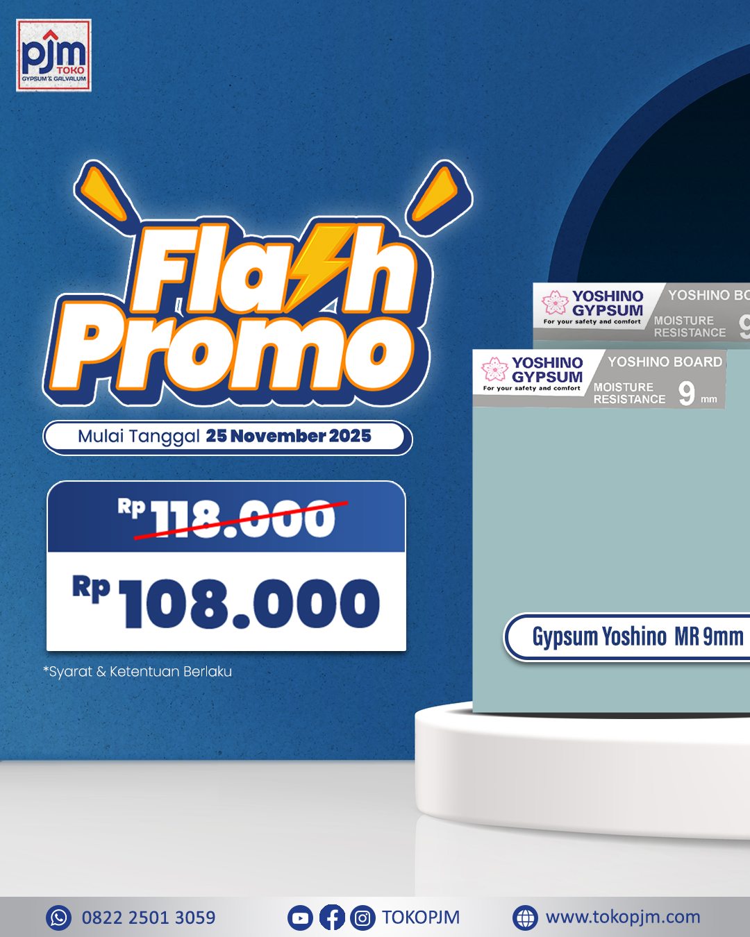 Toko PJM is currently offering a special promo on Gypsum Yoshino MR that you don't want to miss! The price has been slashed from Rp 118,000/sheet to only Rp 108,000/sheet. This promo applies with no minimum purchase, allowing you to buy exactly what your project requires.